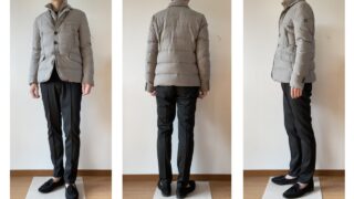 ジャケット:HETREGO エトレゴ テーラード ダウンジャケットインナー:黒クルーネックニットパンツ:jabs archivio ジャブスアルキヴィオ Masaccio マサッチョ 黒ジャージシューズ:黒スェード タッセルローファー
